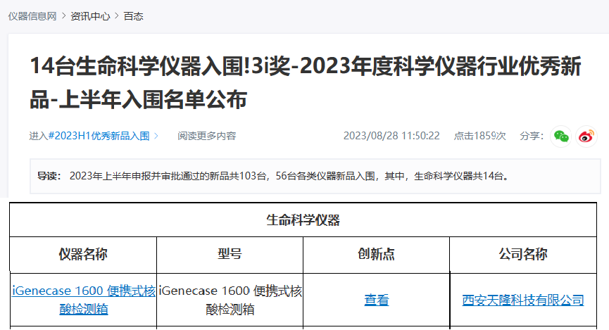 2023-09-07喜訊|iGenecase 1600便攜式核酸檢測箱入圍3i獎2023年優秀新品了解更多