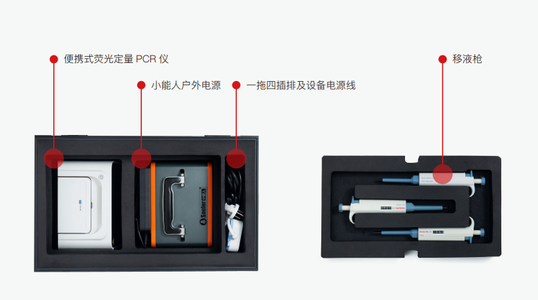 該檢測箱核心設備為天隆GeneFlex 16全自動核酸提取儀和Gentier mini/mini+便攜式熒光定量PCR儀,配備小能人戶外電源及相應實驗試劑耗材等,可搭載日常公共交通,實現拉箱即走,快速到達各類檢測現場,讓檢測不再受限。適用于食品安全、出入境檢疫、傳染病處置等多場景的現場檢測。