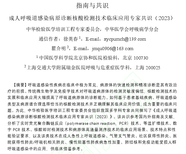 近日,由中華檢驗醫學培訓工程專家委員會,中華醫學會呼吸病學分會組織來自北京協和醫院、上海瑞金醫院、中山大學附屬第一醫院等單位多名專家撰寫的《成人呼吸道感染病原診斷核酸檢測技術臨床應用專家共識(2023)》(下稱《共識》)發布。
