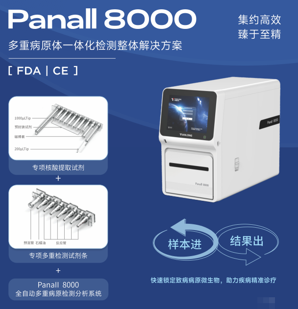 其中,天隆新近推出的呼吸道 17 項病原體核酸檢測試劑,配合天隆Panall 8000全自動多重病原檢測分析系統,樣本進-結果出,一次實現17項病原體核酸的自動化檢測。檢測病原體分別為甲型流感病毒、乙型流感病毒、呼吸道合胞病毒、人鼻/腸病毒、新冠病毒、肺炎支原體、肺炎衣原體、腺病毒、副流感病毒 (1//TT/V型)、冠狀(0C43/HKU1)、人偏病 (L/T型)、冠狀病毒(NL63/229E)、人偏肺(I/I型)、甲型流感病毒(H1/H3/09H1)和博卡病毒。其中,鼻/腸病毒、甲型流感病毒(H3)及甲型流感病毒(H1/09H1)的最低檢出限為 500copies/mL,其他病原體的最低檢出限為 200copies/mL。