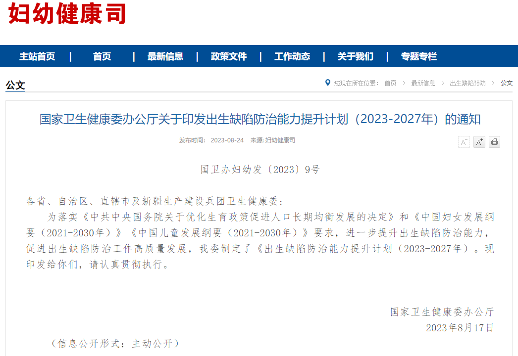 國(guó)家衛(wèi)生健康委發(fā)布《關(guān)于印發(fā)出生缺陷防治能力提升計(jì)劃(2023-2027年)的通知》(以下簡(jiǎn)稱《計(jì)劃》),旨在進(jìn)一步提升出生缺陷防治能力,促進(jìn)出生缺陷防治工作高質(zhì)量發(fā)展。
