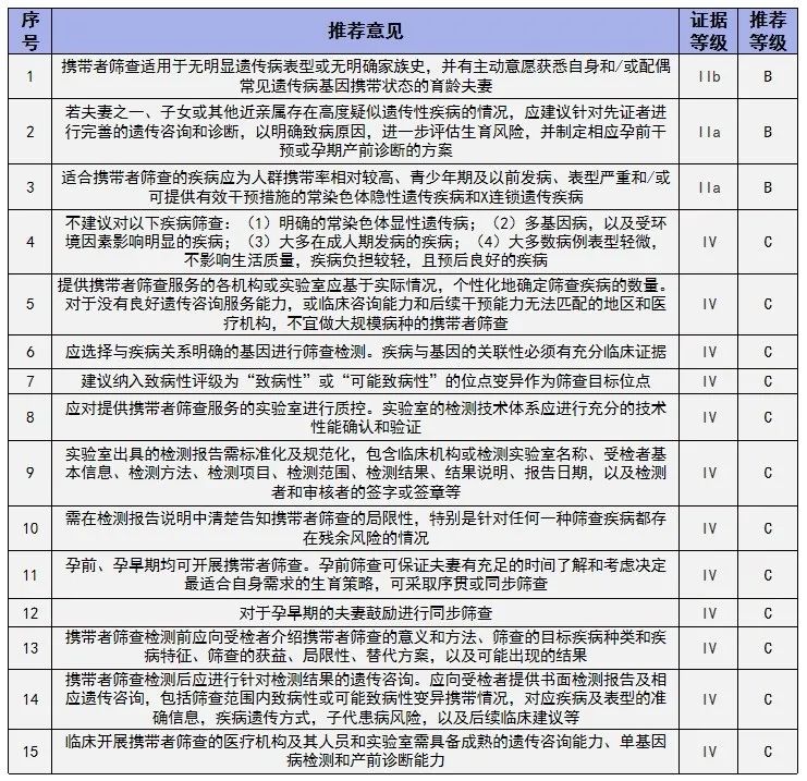 參照國際相關指南及共識,數十位專家學者經充分探討,審慎編寫及多次修改,針對孕前及孕早期常見隱性單基因遺傳病的攜帶者篩查,最終形成如下15條核心意見。