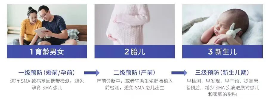 SMA,即脊髓性肌萎縮癥,是此次專家共識首先推薦篩查的遺傳病。該疾病是一種常染色體隱性遺傳神經肌肉病,位居2歲以下兒童致死性遺傳病首位。新生兒發病率1/6000-1/10000,約每60個人中就有1個是SMA致病基因攜帶者。若父母雙方同為攜帶者,每次懷孕孩子有25%的幾率是SMA患者。因此,三級預防是把牢SMA防控關口的重要手段。